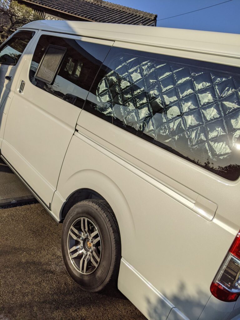 車中泊を度々するのであれば最初から車種専用のマルチシェードをおすすめします!値段は高いけど断熱&遮光は抜群!夏の紫外線もですが特に冬の窓からの冷気は結構なダメージですよ。