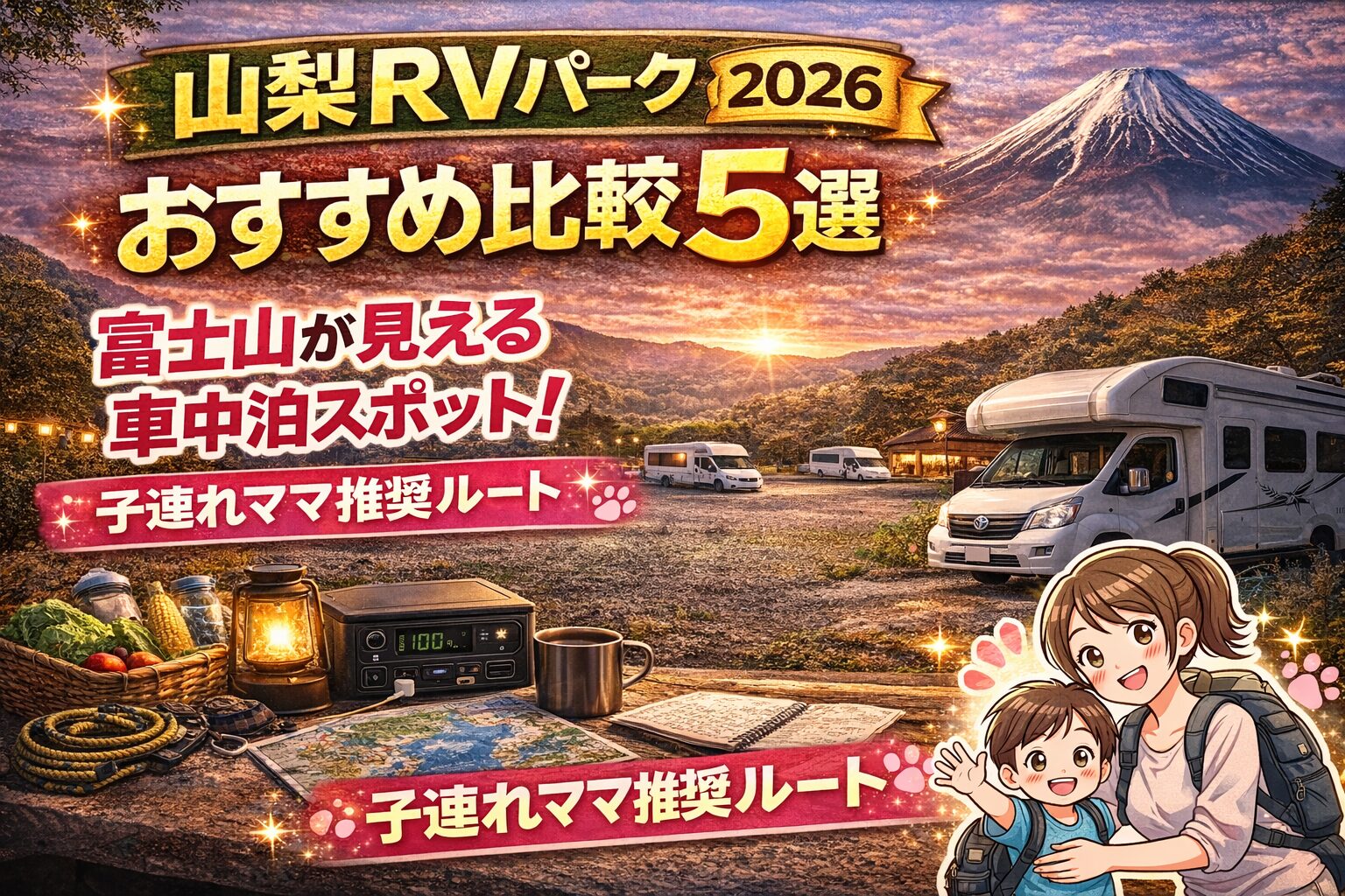 この記事では、8年の車中泊経験を持つママの視点で、「富士山が綺麗に見える」ことはもちろん、「絶品ほうとう・フルーツ」「巨大遊具や動物とのふれあい」がセットで楽しめるRVパークを5つ厳選しました。